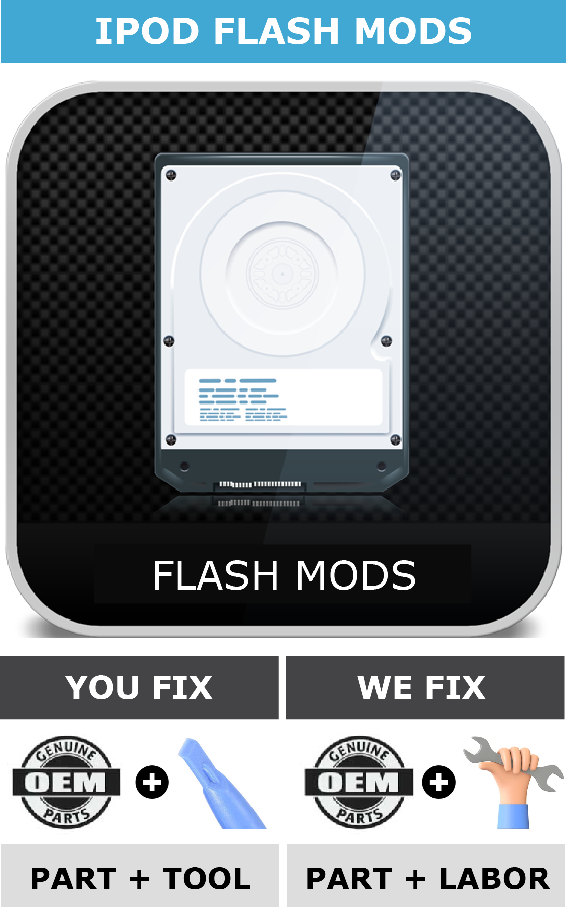 Tap into the latest innovations and most cutting-edge technology by modifying your iPod to utilize a powerful new flash drive. We’ve got it all, including authentic Tarkan iFlash adapters and 100% compatible flash drives guaranteed to elevate your iPod to exciting new levels! To get started, select one of the two options below, both of which include a flash drive adapter + ultra-fast SD card and 1-year warranty. The do-it-yourself kit also includes a free pry tool, or choose our mail-in service and let us handle the repair.
